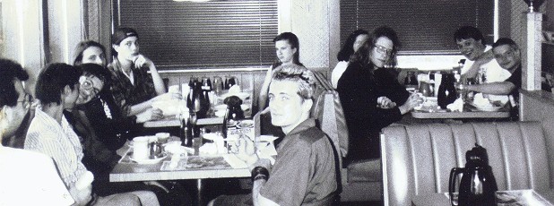 Theesmond, Mick, Jake, Mitch, Cthulhu, d'Kixk, Sondra, Half-of-Abby, Meek, Uncle Phil Bob (?), and Skippy-the-Wonder-Grin at the ShebCo IHOP (RIP), the largest VIB gathering yet?